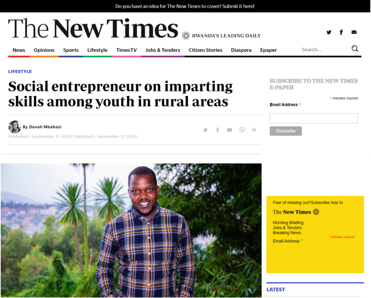 Read more about Dieudonné in THE NEW TIMES article “Social entrepreneur on imparting skills among youth in rural areas”, published on September 17, 2020, written by Donah Mbabazi and